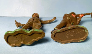 Conocemos al menos 3 tipos de marcas de base para ellas, la original de Herald y las de Britains made in Hong Kong, con peana añadida o con peana integrada, como veis en las fotos.